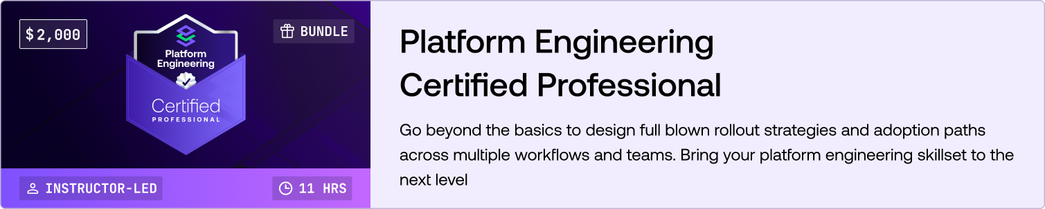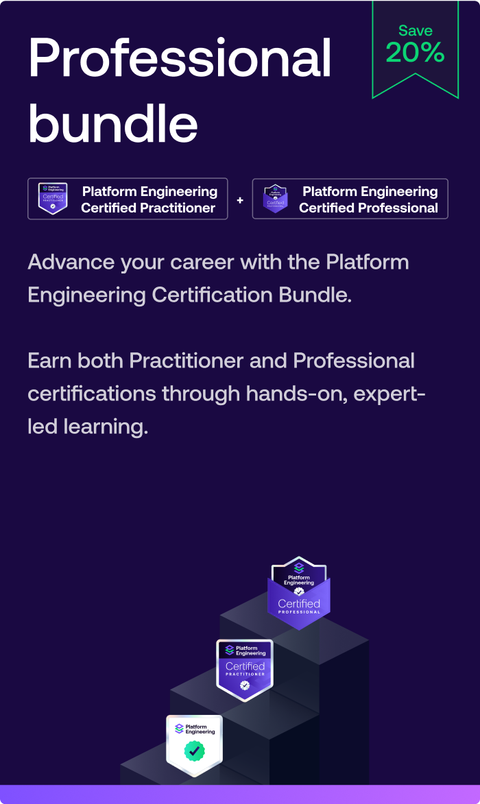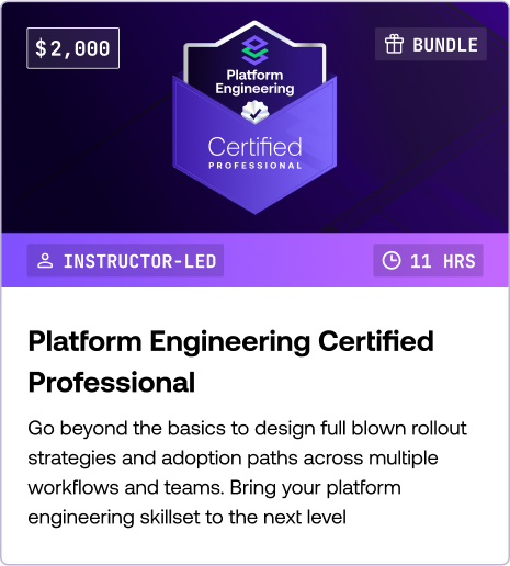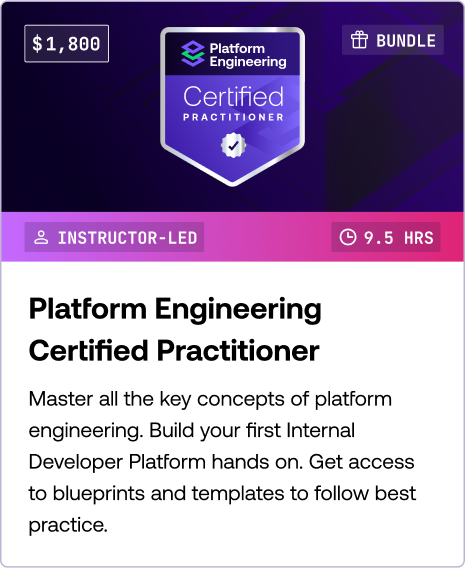 Advance your career with the Platform Engineering Certification Bundle. Earn both Practitioner and Professional certifications through hands-on, expert-led learning.