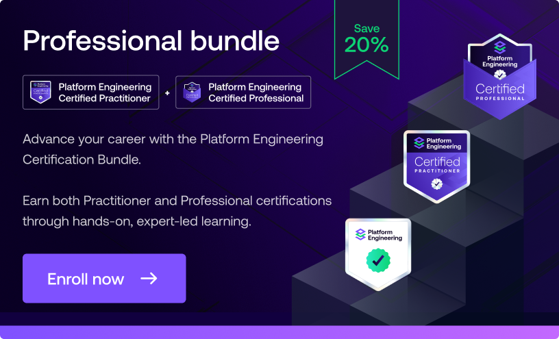 Advance your career with the Platform Engineering Certification Bundle. Earn both Practitioner and Professional certifications through hands-on, expert-led learning.